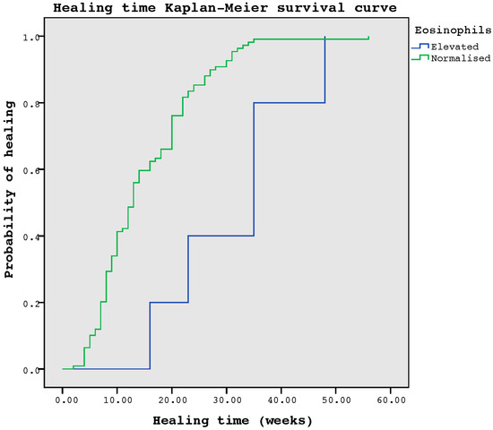 Regarding the increasing blood parameters, we observed that patients with increased eosinophil values took longer to heal at 35 (IQR = 23–35) weeks compared to patients with normal values of eosinophil 13 (IQR = 8–20) weeks (U = 66, z = −2.880, p = 0.004). Figure 1 shows the Kaplan–Meier survival curve for healing time in patients with elevated eosinophils p = 0.005. In the case of basophils, this analysis could not be performed as there were no subjects with increased values, so this variable could not be included in the statistical analyses. The rest of the blood parameters analysed showed no relationship between their increase and longer time to healing (Table 2).