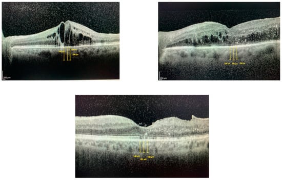 - Zur, D.; Iglicki, M.; Busch, C.; Invernizzi, A.; Mariussi, M.; Loewenstein, A.; Cebeci, Z.; Chhablani, J.K.; Chaikitmongkol, V.; Couturier, A.; et al. OCT biomarkers as functional outcome predictors in diabetic macular edema treated with dexamethasone implant. Ophthalmology 2018, 125, 267–275. [Google Scholar] [CrossRef]