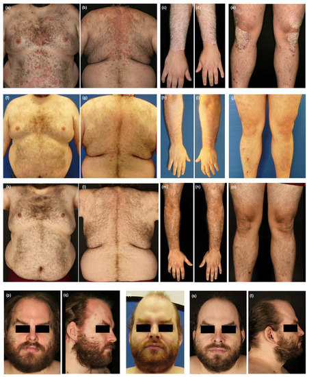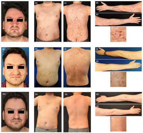 Our second case is about a 35-year-old male obese patient (BMI 44.3) with severe psoriasis since the age of ten. When visiting our department, he presented as a secondary non-responder to risankizumab after a total of 2 years of therapy (PASI 19.5; DLQI 21) (Figure 2a–e,p,q). The patient also suffered from psoriatic arthritis, enthesitis and inflammatory back pain (HLA-B27 negative), which worsened in the last two years. However, the diagnosis of axial spondyloarthritis was not confirmed. He reported morning stiffness of more than 1 h and pain in carpal and metacarpal joints, fingers, lower back and Achilles’s tendons bilaterally. Depression and asthma were among his medical history. Previously, the patient was treated with topicals, phototherapy, non-steroidal anti-inflammatory drugs, methotrexate, etanercept, adalimumab, ustekinumab, secukinumab and guselkumab. Biological therapies had to be switched because of secondary loss of response. Since two IL-23 antibodies, guselkumab and risankizumab, sequentially failed in long-term disease control, we decided to switch the class of biologics and started bimekizumab 320 mg. Bimekizumab was injected according to the label with 8 week intervals after the monthly induction in the initial 16 weeks. Four weeks after the first administration of bimekizumab, his skin condition rapidly improved (PASI 3.7; DLQI 7) (Figure 2f–j,r). Likewise, patient’s joint complaints significantly improved. No morning stiffness or swelling of the joints were reported, only a mild pain in the Achilles tendons persisted. In the annual control examination, the patient presented with PASI 0 and DLQI 0 (Figure 2k–o,s,t) and no joint or back pain. No treatment-specific adverse events, especially candida infections, were reported. The mobility of the patient improved so that he achieved a BMI 40.9 through physical activity and proper nutrition.