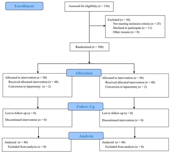 A total of 136 patients were assessed for eligibility; 36 patients were excluded and 100 patients underwent randomization. After randomization, four patients (two in group R and two in group D) were excluded because of conversion to laparotomy during surgery. Consequently, 96 patients (48 in each group) were analyzed (Figure 1). The baseline and surgical characteristics of the patients were similar between the two groups (Table 1).