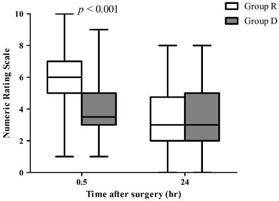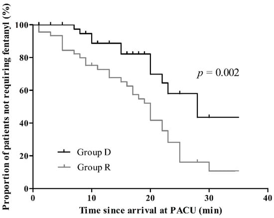Pain scores after 30 min of recovery differed between the groups. Patients in group D reported less pain than those in group R (4.0 ± 1.9 vs. 6.1 ± 2.0, p < 0.001, Figure 2). In the recovery room, the proportion of patients who did not require rescue analgesics was higher in group D than in group R (p = 0.002, Figure 3). However, there was no significant difference in the postoperative pain at 24 h after surgery (3.2 ± 2.0 in group D vs. 3.3 ± 1.8 in group R, p = 0.75).