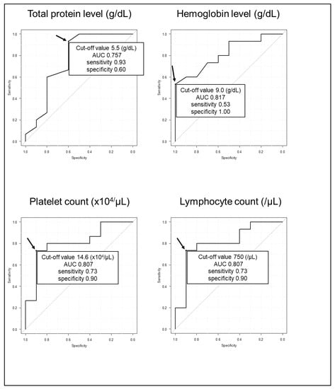 Receiver operating curve analyses and the cutoff values for predicting CMV viremia. The cutoff values for detecting CMV viremia of total protein, hemoglobin, platelet count and lymphocyte count are 5.5 g/dL (area under curve (AUC): 0.757; 95% confidence interval (CI): 0.531–0.983; Sensitivity: 0.93; Specificity: 0.60), 9.0 g/dl (AUC: 0.817; 95% CI: 0.651–0.982; Sensitivity: 0.53; Specificity: 1.00), 14.6 × 104/μL (AUC: 0.807; 95% CI: 0.623–0.991; Sensitivity: 0.73; Specificity: 0.90) and 750/μL (AUC: 0.807; 95% CI: 0.618–0.995; Sensitivity: 0.73; Specificity: 0.90), respectively. The arrows point to the cutoff points.