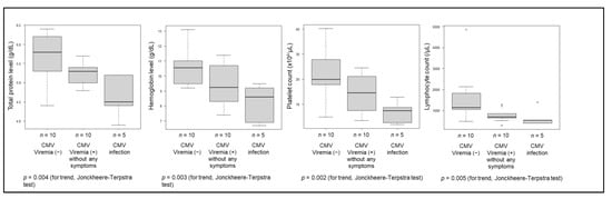 The total protein, hemoglobin, platelet count, and lymphocyte count at the time of the CMV antigenemia test presented significantly decreasing trends in the following order: patients who did not develop CMV viremia (n = 10), patients who developed CMV viremia without any symptoms (n = 10), and patients who developed CMV infection (n = 5) (p values for the trends are as follows: serum total protein (p = 0.004), hemoglobin (p = 0.003), platelet count (p = 0.002) and lymphocyte count (p = 0.005)).