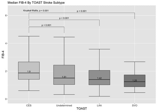 We also analysed the relationship of FIB-4 with several stroke characteristics including stroke severity and TOAST classification. There were more moderate to severe strokes in the FIB-4 > 2.67 group as compared to the FIB-4 < 1.3 group (88.8% vs. 61.2%), and median admitting NIHSS was raised in the FIB-4 > 2.67 compared to FIB-4 < 1.3 group (21 (IQR: 16–24) vs. 12 (IQR: 7–19)), which was confirmed on post hoc analysis (Supplementary Table S2). Furthermore, the median FIB-4 was highest in patients with cardiombolic stroke at 1.90 (IQR: 1.41–2.69) compared to other stroke etiology subtypes according to the TOAST classification. This was followed by a median FIB-4 of 1.51 (IQR 1.04–2.44) in patients with stroke of undetermined etiology, compared to 1.42 (IQR 1.02–2.11) in patients with large-artery atherosclerosis and 1.25 (IQR 0.88–1.74) in patients with small-vessel occlusion (all p < 0.001). (Figure 1) There was a significantly greater prevalence of cardioembolic stroke subtype and lower prevalence of small-vessel occlusion subtype in the FIB > 2.67 compared to FIB < 1.3 group (Table 1 and Supplementary Table S2).