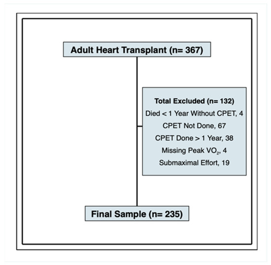 Study Inclusion and Exclusion. The final sample consists of 235 patients who had peak Vo2 measured within the first post-transplant year. Acronyms: CPET, cardiopulmonary exercise test; RER, respiratory exchange ratio.