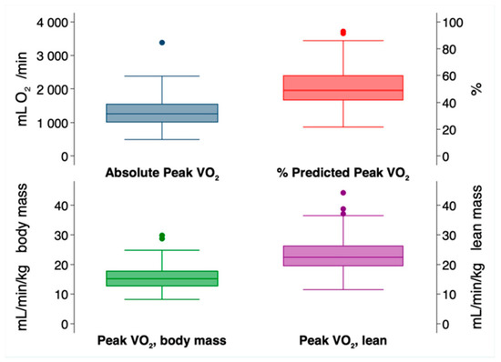 Distribution of Post-Transplant Peak Vo2 Indices. Box plots displaying the median, 1.5× interquartile range, and outliers for each Vo2 metric.