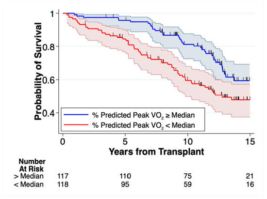 Kaplan–Meier Survival Estimates Stratified by Median % Predicted Peak Vo2. Patients with post-transplant % Predicted Peak Vo2 (%Vo2) below median had significantly lower long-term survival. The median %Vo2 was 49%. Vertical dash marks indicate censored events. Shaded areas represent the 95% Confidence Intervals.