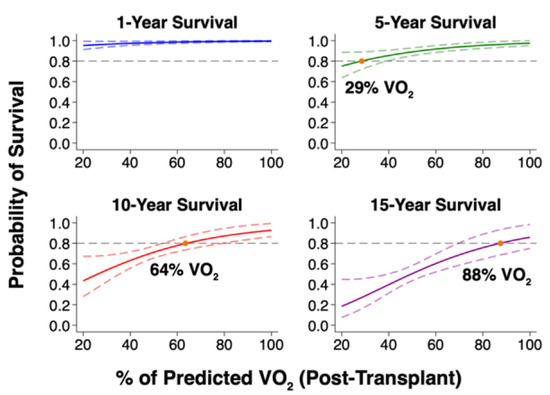 We derived four models predicting survival at 1, 5, 10 and 15 years post-transplant as a function of post-transplant %Vo2 (Figure 4). From each model, we identified a %Vo2 cutoff below which the predicted survival to each timepoint was less than 80%. At 5 years post-transplant, 80% survival (95% CI 72 to 89%) was predicted by a %Vo2 below 29%. At 10 years, the 80% survival threshold (95% CI 74 to 87%) was predicted by a %Vo2 below 64%. Finally, at 15 years, 80% survival (95% CI 69 to 94%) was predicted by a %Vo2 below 88%. Only 5 patients in our sample died within the first year (2%), so no cutoff predicting 1-year survival less than 80% could be estimated.