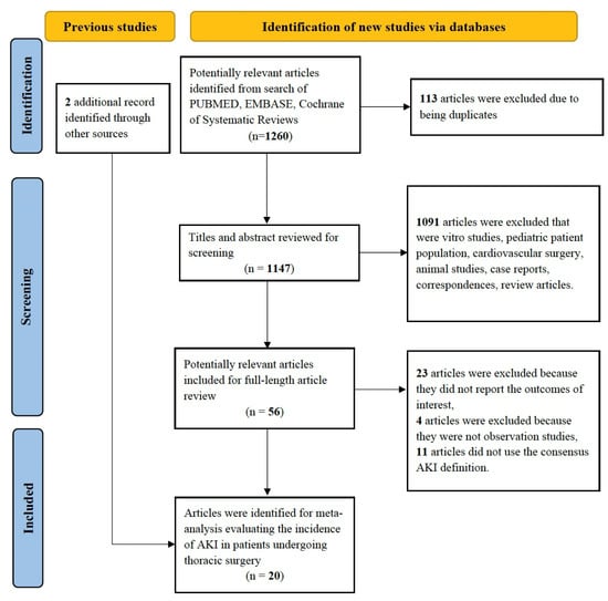 In total, our search identified 1260 records of which 113 records were removed as duplicates and a further 1091 records were excluded for not meeting our eligibility criteria upon the screening of the title and abstract. After a full-text examination, 18 studies met our selection criteria [,,,,,,,,,,,,,,,,,]. The reference lists for the bibliographies of the text articles were screened, which revealed two reports that met our inclusion criteria [,]. Finally, 20 studies including 34,826 patients in all reporting AKI outcomes in the setting of thoracic surgery were included in our analysis. The study identification and selection procedures are presented in Figure 1. Table 1 presents the clinical characteristics of all the included studies.