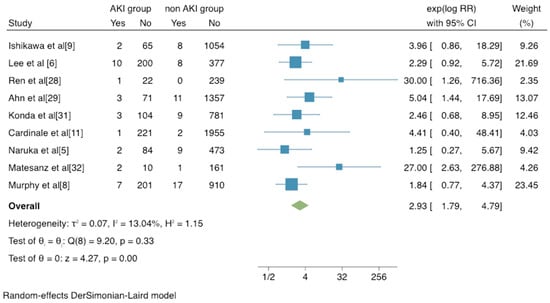 There were five studies [,,,,] that reported the rates of postoperative pulmonary complications and cardiac complications, among which we counted the one with the most cases. The pooled effect demonstrated the incidence of cardiovascular and respiratory complications was significantly higher in patients with AKI than in those without AKI (RR = 2.26, 95% CI: 1.22–4.16, p = 0.01, Figure S1; RR = 3.29, 95% CI: 2.48–4.35, p < 0.001, Figure S2, respectively). Similarly, nine studies [,,,,,,,,] reported the length of postoperative stay, which demonstrated a significant increase in the amounts of patients with postoperative AKI. We did not pool the effect size due to statistical heterogeneity.
