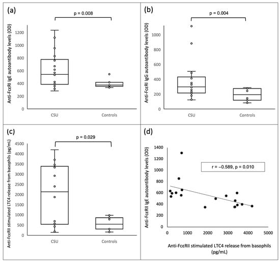 Among the CSU patients, a statistically significant inverse correlation was documented between anti-FcεRII IgE autoantibody levels and LTC4 released from the patients’ basophils after in vitro stimulation with anti-FcεRII antibodies (r = −0.589, p = 0.010) (Figure 1d). Moreover, a similar trend was seen between anti-FcεRI IgE autoantibody levels and spontaneous LTC4 released from the patients’ basophils (r = −0.452, p = 0.06).