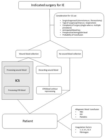 - Surgery for IE was associated with a high probability of a transfusion requirement. Due to more complex cases and the resulting surgical approaches, patients in the ICS group were more likely to be transfused with RBC or coagulation products. The use of ICS led to a significant amount of washed tissue blood for re-transfusion.