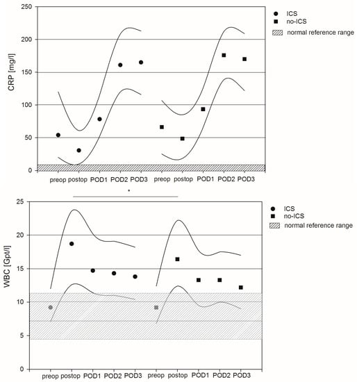 Median values of C-reactive protein (CRP) were preoperatively elevated in both patient groups and further increased in the postoperative phase, with peak values on postoperative day two (POD2). In contrast, white blood cell counts (WBCs) were in the normal range prior to surgery and increased in the postoperative phase. Peak values appeared immediately after surgery and declined within the next three days, with values staying above the normal upper value. Linear regression analysis revealed no significant differences in terms of CRP prior to or after surgery between ICS and no-ICS patients. However, the WBC values were significantly higher immediately after surgery in ICS patients compared to no-ICS patients (p = 0.024). On average, the WBC values of ICS patients were 3.0 Gpt/l higher compared to no-ICS patients after adjustment for confounders (95% CI: 0.39–5.54). Furthermore, reoperation, former values of inflammation and lactate values, as well as markers of organ dysfunction, were also independent factors associated with differences in terms of CRP and WBC values in the perioperative phase. For details, see Figure 2 and Tables S1 and S2 of the Supplementary Materials.