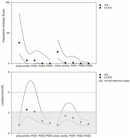 Median values in terms of the vasoactive inotropy score (VIS) peaked intraoperatively and continuously declined within the first three days after surgery. Linear regression analysis found no significant differences between both patient groups. However, the intraoperative lactate level, perioperative renal dysfunction (defined by elevated creatinine) and the grade of inflammation (defined as elevated CRP values) were factors associated with hemodynamic instability. In detail, VIS in patients with elevated preoperative lactate levels were on average 19.7 points higher compared to patients with low preoperative lactate values after adjustment for confounders (95% CI: 8.3–31.2, p = 0.001). Intraoperative VIS in patients with preoperative high creatinine levels were on average 0.3 points higher compared to patients without elevated creatinine levels after adjustment for confounders (95% CI: 0.15–0.45, p = 0.001). Finally, intraoperative VIS in patients with elevated CRP values were on average 0.3 points higher compared to patients with lower CRP values after adjustment for confounders (95% CI: 0.08–0.44, p = 0.005). Median lactate values peaked immediately after surgery and declined over the following postoperative days. Again, ICS was not associated with increased perioperative lactate values, but linear regression analysis revealed the perioperative use of catecholamines, the duration of the CPB and cross clamping time and former lactate values as factors associated with the course of lactate in the referring patient cohort (Figure 3 and Tables S1 and S2 of the Supplement).