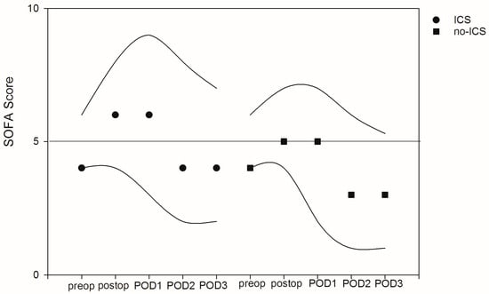 To describe the course of organ dysfunction, the SOFA score was calculated daily. The median preoperative SOFA was 4 [4.0–6.0], with peak values on the day of surgery. There were no significant differences in terms of the referring SOFA scores. The factors associated with organ dysfunction were the grade of inflammation (postoperative SOFA with elevated WBCs were on average 0.1 point higher (95% CI: 0.02–0.145, p = 0.010) after adjustment for confounders), the patient’s age (postoperative SOFA increased on average by 0.05 point with every year of age (95% CI: 0.01–0.08, p = 0.013) after adjustment for confounders) and preexisting organ failure (postoperative SOFA increased on average by 1 point with every point increase in preexisting SOFA score (95% CI: 0.05–1.14, p = 0.001) after adjustment for confounders). A separate evaluation of the underlying laboratory markers predicting organ function showed values above the upper normal range for creatinine and bilirubin as well as values on the lower limit of normal for platelets on POD1 without any differences between ICS and no-ICS patients (see Figure 4 and Tables S1 and S2 of the Supplement).