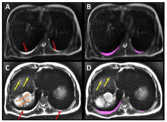 Axial T2 weighted images show pleural fluid (red arrows on (A,C)) which was measured by annotating the fluid, (B,D), in the thoracic cavity (pink label) to determine its volume. Liver cysts (yellow arrows) and the superior pole of the polycystic right kidney were also observed on the more inferior slices, (C,D).