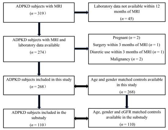 Matching CKD stage was possible for a subpopulation of 110 ADPKD and 110 control subjects to control for kidney function (Table 2B and Table S1). In this subgroup, the mean eGFR was within the normal range in both ADPKD and control subjects (89 vs. 94 mL/min/1.73 m2, p = 0.2) and similar for the two groups. By contrast, the eGFR in the entire ADPKD group was lower than in the control group in Table 2 (70 vs. 92 mL/min/1.73 m2.