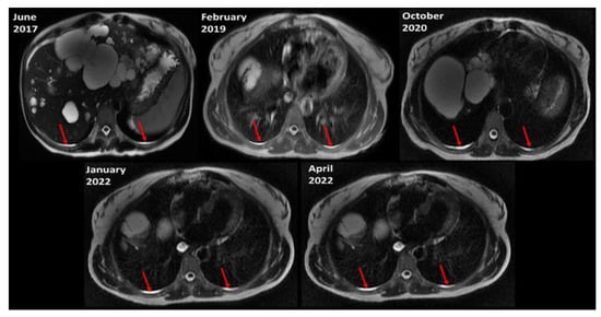 Pleural effusions (red arrows) are similar on successive axial T2-weighted MRI scans of the same subject over 5 years.