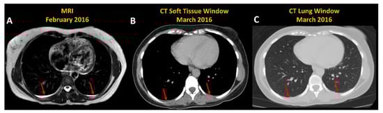 Pleural effusion (red arrows) seen on the same patient on (A) axial T2-weighted MRI and 1 month later on CT (B) soft tissue and (C) lung windows. Note that CT does not show the pleural fluid as well even though the amount of fluid is unchanged.