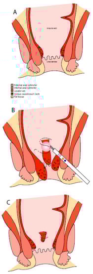 - Sun, Z.; Migaly, J. Review of Hemorrhoid Disease: Presentation and Management. Clin. Colon Rectal Surg. 2016, 29, 22–29. [Google Scholar] [PubMed]
