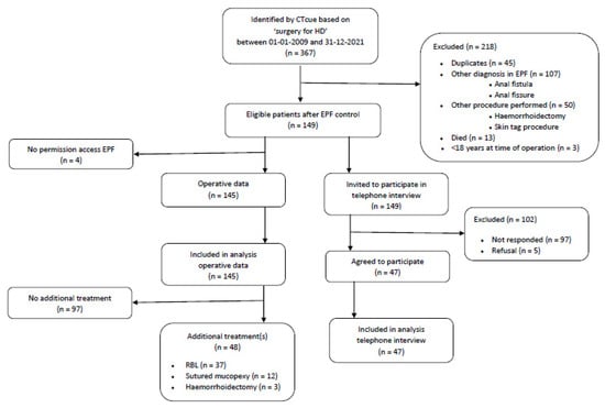 In total, 367 consecutive patients were retrieved from the EPF, of which 149 were deemed eligible as they were diagnosed with grade I–IV HD, underwent SH and were older than 18 years at the time of the operation. Four patients did not give consent for access to their EPF. Of the 145 patients, 50 patients gave additional written informed consent for a telephone interview to assess the current symptoms of HD. On average, patients were operated nine years ago (IQR 5–11) and were diagnosed with grade III (37.2%) or IV (29.7%) HD. As only one patient was diagnosed with grade I HD (0.7%), grade I and grade II HD were combined. Patient characteristics of the total cohort (n = 145) and the subgroup (n = 50) are summarized in Table 1. A study flowchart is shown in Figure 2.
