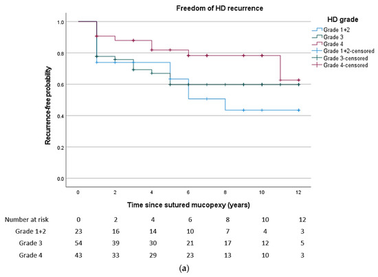 The distribution of recurrence according to HD grade can be found in Table 4. The probability of being free from recurrence was 39.9% (95% CI, 15.6–64.2) for grade II, 59.8% (95% CI, 45.9–73.7) for grade III, 62.7% (95% CI, 33.1–92.3) for grade IV after 12 years.