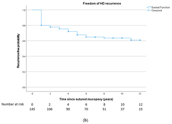 This retrospective cohort study assessing the short- and long-term efficacy and safety of the SH in 145 patients demonstrated a freedom from recurrence of 88.3% (95% CI, 83.1–93.5) at six months, 80.0% (95% CI, 73.5–86.5) at one year and 67.7% (95% CI, 59.7–75.7) at five years. Other studies reported lower recurrence rates for the SH than ours. Pakravan et al. included 38 patients, of whom none required additional surgery after the follow-up of six months [15]. Aigner et al. followed their 40 patients for one year and reported a recurrence rate of 5% in the SH group [12]. Only one randomized controlled trial has been conducted on the efficacy of SH, reporting on 100 patients with a follow-up of two years [21]. In this trial, DG-HAL was compared with suture fixation alone. At two years’ post-procedure, a low recurrence rate of 2.3% in the suture fixation group was seen. Our higher recurrence rate could be explained by our older population. The mean age of our study population was ten years higher than in the above-mentioned studies. It is known that the incidence of HD increases with age and the peak age for HD development is between 45 and 65 years [22,23].