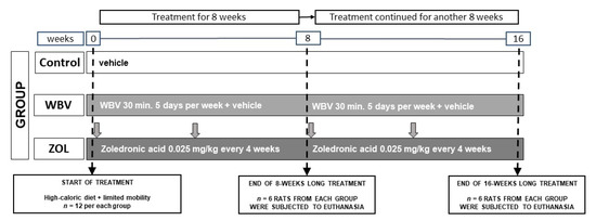 Scheme of the experimental design. Rat from all groups were fed a high-calorie diet and kept in limited mobility conditions. Rats from the WBV group were subjected to whole-body vibration treatment (30 min, 5 days per week), while rats from the ZOL group were injected intramuscularly with zoledronic acid at a dose of 0.025 mg/kg body weight every 4 weeks. Rats from the Control and WBV groups were injected with the vehicle (0.9% NaCl) at the same volume. Vertical gray arrows show the time of injections. At the end of the 8- or 16-week-long treatment, n = 6 animals from each group were euthanized.