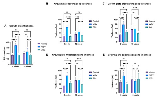 The effect of whole-body vibration (WBV) or zoledronic acid (ZOL) supplementation on the thickness of zones in the growth plate cartilage in rats subjected to obesity and immobility: (A) total growth plate thickness; (B) resting zone; (C) proliferating zone; (D) hypertrophy zone; (E) calcification zone. Control—the control group included rats subjected to obesity and immobility not treated with WBV or ZOL; WBV—the WBV group included rats subjected to obesity and immobility with whole-body vibration treatment (30 min, 5 days per week); ZOL—the ZOL group included rats subjected to obesity and immobility and injected intramuscularly with zoledronic acid at a dose of 0.025 mg/kg body weight every 4 weeks. Data are mean values ±SD from n = 6 rats. Statistical significance: ns—not significant; * p < 0.05; *** p < 0.001; **** p < 0.0001 (Tukey’s HSD test or Kruskal–Wallis H test).