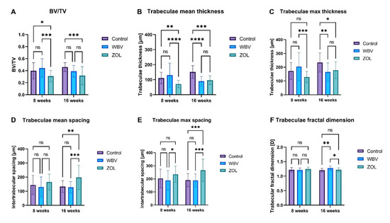 The effect of whole-body vibration (WBV) or zoledronic acid (ZOL) supplementation on the trabecular morphology in femur distal metaphysis in rats subjected to obesity and immobility: (A) bone volume fraction (BV/TV); (B) trabeculae maximum thickness; (C) trabeculae mean thickness; (D) trabeculae mean spacing; (E) trabeculae maximum spacing; (F) trabeculae fractal dimension. Control—the control group included rats subjected to obesity and immobility not treated with WBV or ZOL; WBV—the WBV group included rats subjected to obesity and immobility with whole-body vibration treatment (30 min, 5 days per week); ZOL—the ZOL group included rats subjected to obesity and immobility and intramuscularly with zoledronic acid at a dose of 0.025 mg/kg body weight every 4 weeks. Data are mean values ± SD from n = 6 rats. Statistical significance: ns—not significant; * p < 0.05; ** p < 0.01; *** p < 0.001; **** p < 0.0001 (Tukey’s HSD test or Kruskal–Wallis H test).