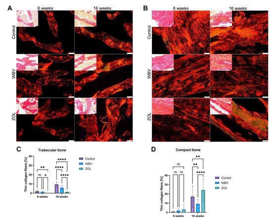 Thin (immature) collagen content in femora trabeculae in rats subjected to obesity and immobility: representative images of PRS-stained sections of (A) trabecular and (B) compact bone observed in polarized light (big images) and bright light (small images). The thin, immature collagen fibers are green and the mature fibers are orange or red. Insets: the same sections observed in bright-field. All scale bars represent 50 μm; bar graphs of thin (immature) collagen content in (C) femora trabeculae and (D) femora compact bone. Data are mean values ± SD from n = 6 rats. Control—the control group included rats subjected to obesity and immobility not treated with WBV or ZOL; WBV—the WBV group included rats subjected to obesity and immobility with whole-body vibration treatment (30 min, 5 days per week); ZOL—the ZOL group included rats subjected to obesity and immobility and injected intramuscularly with zoledronic acid at a dose of 0.025 mg/kg body weight every 4 weeks. Statistical significance: ns—not significant; * p < 0.05; ** p <0.01; **** p < 0.0001 (Tukey’s HSD test or Kruskal–Wallis H test).