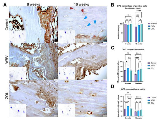 The immunohistochemical reaction for osteoprotegerin (OPG) in the compact bone of femora of rats subjected to obesity and immobility: (A) Representative images of the immunohistochemical reactions for OPG. Brown and blue arrowheads indicate examples of positive and negative reaction cells, respectively. Insets show control immunohistochemical staining without primary antibody. All scale bars represent 50 μm; bar graphs show the (B) the percentage of OPG-positive cells and the intensity of immunoexpression of OPG (C) in cells (osteocytes), and (D) compact bone matrix measured by the 8-bit grayscale pixel brightness value (the higher the pixel value, the higher the intensity of the immunohistochemical reaction). Data are mean values ± SD from n = 6 rats. Control—the control group included rats subjected to obesity and immobility not treated with WBV or ZOL; WBV—the WBV group included rats subjected to obesity and immobility with whole-body vibration treatment (30 min, 5 days per week); ZOL—the ZOL group included rats subjected to obesity and immobility and injected intramuscularly with zoledronic acid at a dose of 0.025 mg/kg body weight every 4 weeks. Statistical significance: ns—not significant; * p < 0.05; ** p < 0.01; *** p < 0.001; **** p < 0.0001 (Tukey’s HSD test or Kruskal–Wallis H test).