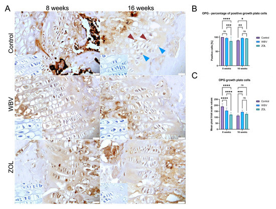 The immunohistochemical reaction for osteoprotegerin (OPG) in the growth plate of femora of rats subjected to obesity and immobility: (A) Representative images of the immunohistochemical reactions for OPG. Brown and blue arrowheads indicate examples of positive and negative reaction cells, respectively. Insets show control immunohistochemical staining without primary antibody. All scale bars represent 50 μm; bar graphs show (B) percentage of cells showing positive reaction to OPG, and (C) the intensity of immunoexpression of OPG in the growth plate cells measured by the 8-bit grayscale pixel brightness value (the higher the pixel value, the higher the intensity of the immunohistochemical reaction). Data are mean values ± SD from n = 6 rats. Control—the control group included rats subjected to obesity and immobility not treated with WBV or ZOL; WBV—the WBV group included rats subjected to obesity and immobility with whole-body vibration treatment (30 min, 5 days per week); ZOL —the ZOL group included rats subjected to obesity and immobility and injected intramuscularly with zoledronic acid at a dose of 0.025 mg/kg body weight every 4 weeks. Statistical significance: ns—not significant; * p < 0.05; ** p < 0.01; *** p < 0.001; **** p < 0.0001 (Tukey’s HSD test or Kruskal–Wallis H test).