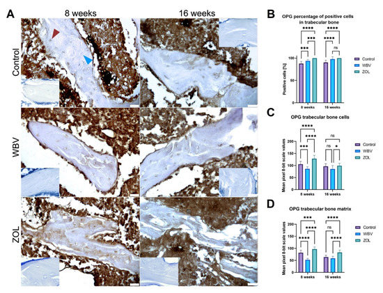 The immunohistochemical reaction for osteoprotegerin (OPG) in the trabeculae of distal metaphysis of femora of rats subjected to obesity and immobility: (A) Representative images of the immunohistochemical reactions for OPG. Brown and blue arrowheads indicate examples of positive and negative reaction cells, respectively. Insets show control immunohistochemical staining without primary antibody. All scale bars represent 50 μm; bar graphs show the (B) the percentage of OPG-positive cells and the intensity of immunoexpression of OPG (C) in trabecular bone cells, and (D) trabecular bone matrix measured by the 8-bit grayscale pixel brightness value (the higher the pixel value, the higher the intensity of the immunohistochemical reaction). Data are mean values ± SD from n = 6 rats. Control—the control group included rats subjected to obesity and immobility not treated with WBV or ZOL; WBV—the WBV group included rats subjected to obesity and immobility with whole-body vibration treatment (30 min, 5 days per week); ZOL—the ZOL group included rats subjected to obesity and immobility and injected intramuscularly with zoledronic acid at a dose of 0.025 mg/kg body weight every 4 weeks. Statistical significance: ns—not significant; * p < 0.05; *** p < 0.001; **** p < 0.0001 (Tukey’s HSD test or Kruskal–Wallis H test).