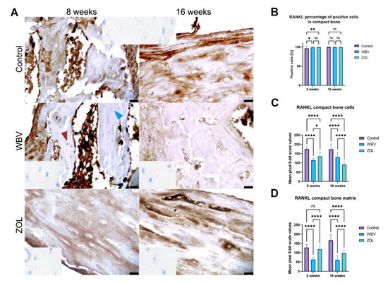 The intensity of the RANKL immunoreaction in compact bone is presented in Figure 8, with representative images presented in Figure 8A. The lowest number of RANKL- positive cells in the compact bone was in the Control group after 8 weeks compared to the other groups; after 16 weeks, no differences between groups were noted (Figure 8B). The most intense RANKL immunoreaction in the bone cells of the compact bone was observed in the Control group after 8 weeks, less intensity was noted in the ZOL group, and the lowest intense reaction was observed in the WBV group (Figure 8C). The most intense RANKL immunoreaction in the bone cells of the compact bone was observed in the Control group after the 16-week-long treatment as well. Less intensity of the RANKL immunoreaction in the bone cells was noted in the WBV group and the lowest intensity reaction was observed in the ZOL group. The intensity of the RANKL immunoreaction in the matrix was lower in the WBV group compared to the intensity noted in other groups (Figure 8D), while the intensity of the RANKL immunoreaction in the matrix after 8 weeks was the highest in the Control group, lower intensity was noted in the ZOL group, and the lowest in the WBV group. Other changes were not noted.