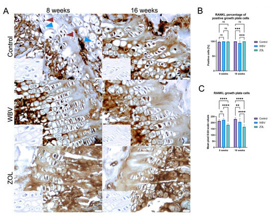 The representative images of the observed RANKL immunoreaction in the growth plate are presented in Figure 7B, the percent of positive RANKL in the growth plate cells is presented in Figure 9B. The lowest number of RANKL-positive cells in the growth plate was noted in the WBV group after 16 weeks compared to other groups, a higher percentage was noted in the ZOL group, and the highest in the Control group. Other changes were not noted. The lowest intensity of RANKL immunoreaction after 8 weeks was noted in the ZOL group, which was significantly lower than in the other two groups (Figure 9C). After 16 weeks, the lowest intensity in RANKL immunoreaction was still observed in the ZOL group, followed by the WBV group, and the highest observed in the Control group (Figure 9C).