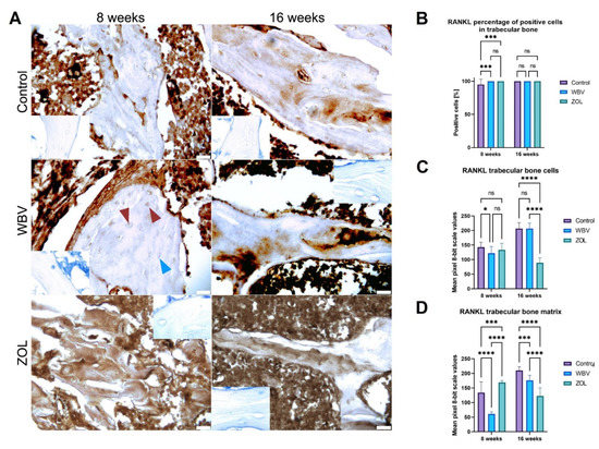 The immunohistochemical reaction for receptor activator for nuclear factor kappa-B ligand (RANKL) in the trabeculae of distal metaphysis of femora of rats subjected to obesity and immobility: (A) Representative images of the immunohistochemical reactions for RANKL. Brown and blue arrowheads indicate examples of positive and negative reaction cells, respectively. Insets show control immunohistochemical staining without primary antibody. All scale bars represent 50 μm; bar graphs show the (B) the percentage of RANKL-positive cells and the intensity of immunoexpression of RANKL (C) in trabecular bone cells, and (D) trabecular bone matrix measured by the 8-bit grayscale pixel brightness value (the higher the pixel value, the higher the intensity of the immunohistochemical reaction). Data are mean values ± SD from n = 6 rats. Control—the control group included rats subjected to obesity and immobility not treated with WBV or ZOL; WBV—the WBV group included rats subjected to obesity and immobility with body vibration treatment (30 min, 5 days per week); ZOL—the ZOL group included rats subjected to obesity and immobility and injected intramuscularly with zoledronic acid at a dose of 0.025 mg/kg body weight every 4 weeks. S Statistical significance: ns—not significant; * p < 0.05; *** p < 0.001; **** p < 0.0001 (Tukey’s HSD test or Kruskal–Wallis H test).