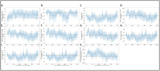 When stratifying the cohort based on sex, weight, and ejection fraction, we found sex-time interaction in several parameters including HR, SV, CO, CI, and SVR. When comparing the final stage of diuresis with baseline measurements (Figure 4), males had a reduction in CO (−0.6 ± 0.6 L/min) while in females CO increased (0.3 ± 0.9 L/min, p = 0.006). Similar findings were observed in SV (−1.7 ± 1.8 and 1.1 ± 3.1 mL, respectively, p = 0.011), CI (−0.3 ± 0.3 and 0.2 ± 0.6 L/min/m2, respectively, p = 0.017), and HR (−4.9 ± 5.0 and 3.2 ± 7.2 beats per minute, respectively, p = 0.003), while the SVR showed inverse association (67.0 ± 107.0 and −64.2 ± 134.9 dynes/sec/cm−5, respectively, p = 0.011). Significant differences were also found between patients with or without obesity when comparing baseline and last quartile measurements. SBP and PP did not change in the group without obesity, yet decreased in the group with obesity (SBP: −0.1 ± 12.0, −9.6 ± 10.0 mmHg; PP: 0.6 ± 8.4, −7.7 ± 7.7 mmHg; p = 0.046, p = 0.024, respectively). No significant differences were observed when stratifying the data based on ejection fraction.