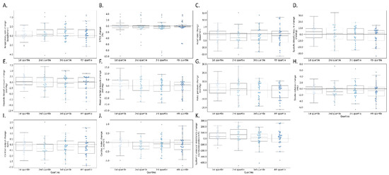 Relative changes from baseline in measured parameters along the quartiles of diuretic treatment. (A) respiratory rate (RR), (B) blood oxygen saturation (SpO2–%), (C) systemic vascular resistance (dynes/sec/cm−5), (D) heart rate (beats per minute), (E) stroke volume (milliliters), (F) cardiac output (liter/minute), (G) cardiac index (liter/minute/body surface area), (H) systolic blood pressure (mmHg), (I) diastolic blood pressure (mmHg), (J) pulse pressure (mmHg), (K) mean arterial pressure (mmHg).