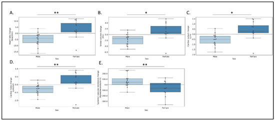 Significant relative changes from baseline in measured parameters from baseline to the fourth quartile of intravenous treatment stratified by sex. (A) heart rate (beats per minute), (B) stroke volume (milliliters), (C) systemic vascular resistance (dynes/sec/cm−5), (D) cardiac output (liter/minute), (E) cardiac index (liter/minute/body surface area). * p < 0.05, ** p < 0.01.