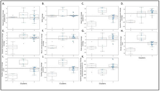 Relative changes from baseline in measured parameters from baseline to the fourth quartile of intravenous treatment in the three phenotypic clusters. (A) respiratory rate (RR), (B) blood oxygen saturation (SpO2-%), (C) systemic vascular resistance (dynes/sec/cm−5), (D) heart rate (beats per minute), (E) stroke volume (milliliters), (F) cardiac output (liter/minute), (G) cardiac index (liter/minute/body surface area), (H) systolic blood pressure (mmHg), (I) diastolic blood pressure (mmHg), (J) pulse pressure (mmHg), (K) mean arterial pressure (mmHg).