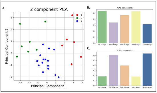 Principal Component Analysis (PCA) was used for dimensionality reduction together with the k-means clusters (Figure 6). According to the PCA, the two principal components were responsible for 97% variation in the patients, where changes in HR, DBP, and CI contributed mainly to component 1, while SBP and SVR contributed mainly to component 2 (Figure 6).