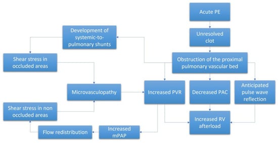 Microvasculopathy has been detected in both the occluded and non-occluded lung areas in patients with CTEPH []. Various mechanisms have been proposed to explain this phenomenon. Among the possible etiologies, the remodeling of small vessels in non-occluded regions may be the result of increased pressure secondary to the occlusion which will result in more blood flow toward non-occluded lung segments; this will ultimately aggravate the ventilation and perfusion mismatch and trigger shear stress [,]. Moreover, the exposure of small vessels to high pressure and the release of vasoactive mediators can lead to endothelial dysfunction and microvasculopathy []. Impaired angiogenesis and inflammation have also been involved []. Recent studies have highlighted the contributions of systemic-to-pulmonary vascular anastomoses in the induction of microvasculopathy within occluded segments of the lungs []. Collectively, these processes contribute to the progressive increases in PVR and RV afterload. The microvascular component may also explain why some CTEPH patients do not respond to surgical treatment (PEA or BPA) and why others can be managed effectively with medical therapy []. The information provided in Figure 1 summarizes the pathophysiology underlying the observed increase in RV afterload in patients diagnosed with CTEPH.