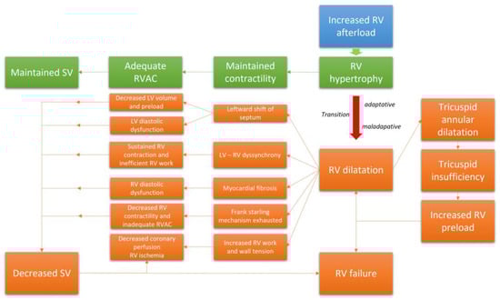When the mechanisms leading to adaptation are ultimately exhausted and the RV has no further capacity to adapt, the RV enters into a phase of maladaptive remodeling with volumetric adaptation []. This phase is marked by eccentric hypertrophy, RV chamber enlargement, and ultimately dyssynchrony with the left ventricle (LV) []. In this phase, the SV is maintained mainly through the Frank–Starling mechanism. The alteration of RV geometry leads to annular dilatation; this will ultimately result in functional tricuspid regurgitation (TR), which will decrease the RVSV and increase the RV preload. Moreover, given the extent of ventricular interdependence within the pericardial space, marked RV dilatation will alter LV geometry due to a leftward shift of the interventricular septum []. This displacement will impair LV diastolic function and exacerbate the decrease in CO. The dyssynchrony that develops between the two ventricles will extend the duration of the RV contraction beyond the closure of the pulmonary valves; this will result in additional increased RV wall stress as well as RV work and mechanical inefficiency []. This response will also contribute to the leftward shift of the septum, reduced filling space for the LV, and further decreases in the SV []. PH may also result in RV diastolic dysfunction due to cardiomyocyte hypertrophy and myocardial fibrosis, which will result in a progressive increase in RV wall stiffness, RV filling pressures, elevated right atrial pulmonary (RAP) pressures, and venous congestion [,]. The RV-PAC progressively evolves toward an inadequate relationship characterized by progressive uncoupling []. Furthermore, the decrease in systemic blood flow results in deteriorating coronary perfusion despite the increased oxygen demand that develops in response to RV hypertrophy and increased RV work []. Increases in RV wall tension and decreases in RV capillary perfusion will both aggravate ischemia. Progressive cardiac dysfunction ensues, with reductions in RV contractility, local ischemia, and myocardial fibrosis that eventually culminate in RV failure []. Collectively, this mechanism and relationships explain why RV function is the main leading prognostic indicator in patients with CTEPH. Figure 2 summarizes the evolution of the RV function in CTEPH.