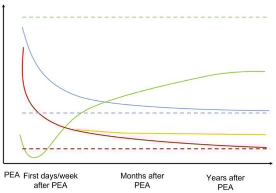 Other explanations that have been proposed to explain the incomplete restoration of RV function after PEA involve the development of myocardial fibrosis and thus intrinsic decreased contractility. Similarly, RVSV also improved after PEA, albeit without a complete restoration to levels exhibited by healthy subjects []. Moreover, improvements in these parameters with exercise were also limited and correlated with symptoms. A recent cMRI study of 22 CTEPH patients that was designed to assess regional myocardial function after PEA revealed substantial heterogeneity with respect to recovery of peak systolic longitudinal (i.e., no improvement at 12 days after PEA), radial, and circumferential strain (i.e., improvement at 12 days after PEA) in both ventricles by tissue-tracking analysis despite significant improvements in mPAP []. These findings suggest the possibility of differential timing of recovery for different types of myocardial fibers according to their relative overload and may also explain the progressive restoration of RV function after PEA. Figure 3 summarizes the evolution of RV structure and function after PEA.