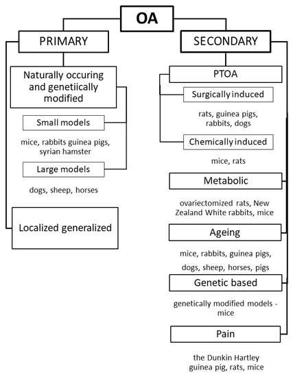 The heterogeneous etiology of OA poses challenges for its classification and the introduction of efficient treatments. OA is typically classified into primary (idiopathic) and secondary OA based on the etiology. Primary OA is a naturally occurring condition due to degenerative changes in the joint. It is classified into localized OA, which affects one joint, and generalized OA, which affects more joints [17]. Idiopathic OA might occur naturally, such as in genetically modified mice [19]. Secondary OA, in turn, is involved in different causes and risk factors, classified as systemic risk factors (gender, age, diet, congenital diseases, and metabolic disorders or bone diseases) and local risk factors (injury and physical activity/sport). For these reasons, one universal treatment cannot be applied to all patients suffering from OA [2,17].