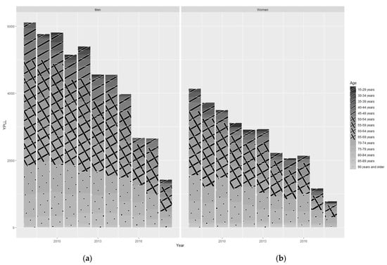 Men’s and women’s distribution of years of potential life lost (YPLL) during the study period: (a) men; (b) women. Age distribution: 15 to 49, one line; 50 to 69, crossed lines; 70 to 90, points.