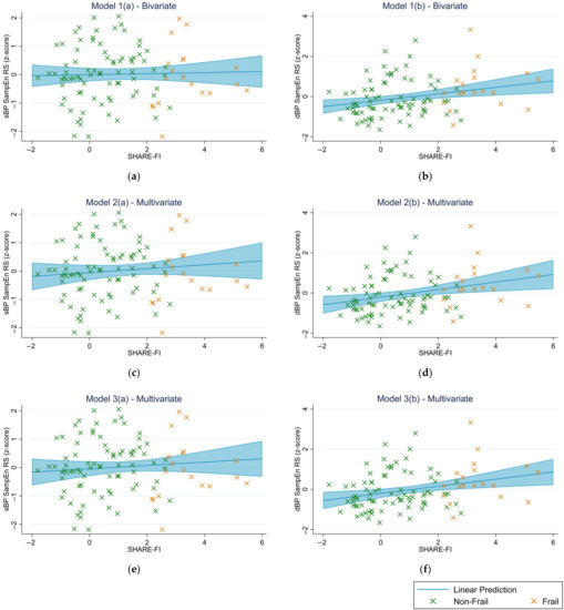 Results from robust linear regression models investigating the relationship between the SHARE-FI continuous score and BP SampEn are reported in Table 2. For all three models, higher dBP SampEn was associated with higher SHARE-FI score (β = 0.38 to 0.43 (per 1 SD), p ≤ 0.008). All models also revealed a higher disease burden/severity (as quantified by CIRS-G score) with increased SHARE-FI score (β = 0.19 to 0.20, p ≤ 0.003). In model 3(a), being a current smoker was associated with higher SHARE-FI score; however, smoking was not significant in model 3(b). The linear relationships between the SHARE-FI score and BP SampEn are also illustrated graphically in Figure 1 using margin plots from each of the models investigated. Residuals from the models, as assessed visually by normal quantile plots and standardized normal probability plots, and numerically by the skewness-kurtosis test for normality, were normally distributed. There was no collinearity between covariates in models (2) and (3), with all VIF values ≤ 1.46.