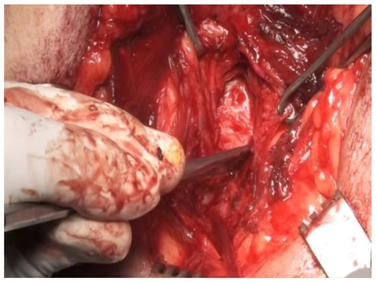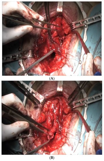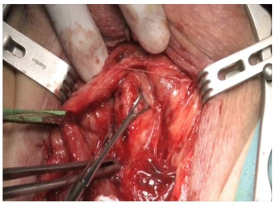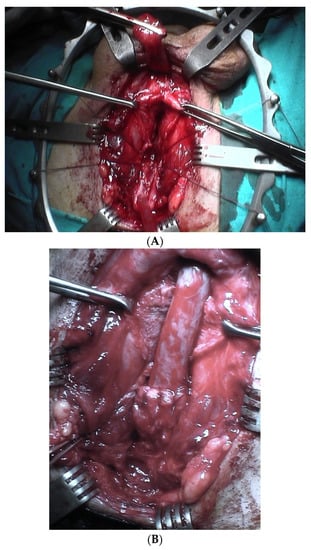 In the majority of cases, the defect between the urethral ends is small and the ideal treatment is an end-to-end urethroplasty via the perineal route. In most cases, mobilization of the bulbar urethra up to the penoscrotal junction will allow performing a spatulated tension-free anastomosis. In cases with extensive defects, sequential maneuvers exist to achieve a tension-free anastomosis []. First is urethral mobilization (Figure 1) and separation of the corpora cavernosa, also known as crural separation (Figure 2A,B). Beginning at the level of the crus and progressing distally about 4–5 cm, this separation allows to position of the urethra between the corpora cavernosa, hence shortening the distance to the proximal urethral end. If this is not sufficient, an inferior pubectomy may be performed (Figure 3). This allows the urethra to be redirected cephalad, providing an additional 2 cm. Finally, if these maneuvers are not sufficient, supracrural rerouting is performed by passing the urethra around the lateral side of the left or right corporal body (Figure 4A,B). This shortens the distance of the anastomosis by up to 2 cm.