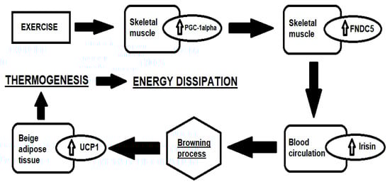 Irisin is a myokine secreted into the bloodstream mainly by myocytes in response to muscle contraction and, in smaller quantities, by adipocytes. Irisin appears to contribute to the increase in energy expenditure via the conversion of white adipose tissue (WAT) into brown adipose tissue (BAT), achieved through the stimulation and up-regulation of the gene expression of uncoupling protein 1 (UCP1) []. From this conversion, an increase in thermogenesis is derived, thus promoting greater glucose tolerance, lower insulin resistance, and reduction in fat mass and body weight []. The irisin precursor has been identified in the fibronectin type 3 domain-containing protein 5 (FNDC5), a membrane protein which, when cleaved, generates irisin. Physical exercise induces an increase in peroxisome-proliferator-activated receptor gamma coactivator 1-alpha (PGC1-α), which stimulates the expression of the FNDC5 gene and thus the synthesis of irisin, causing an induction of the WAT “browning” process (Figure 1) [].